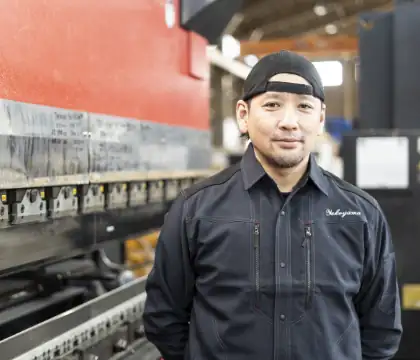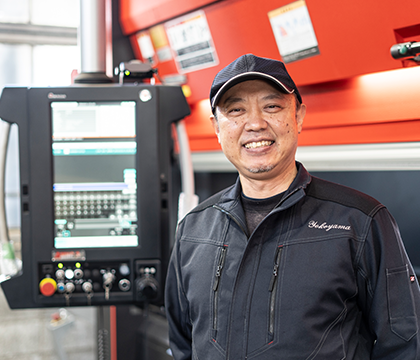 今から30年ほど前のこと。溶接の国家資格を取りたいと専門学校に通っていました。その時にたまたま学校を訪れていた社長に声をかけていただいたのが、私と横山製作所との出会いです。当時は入社には至らなかったのですが、その後も折に触れて私のことを気にかけてくださっていた社長の人柄に惚れて会社の一員になることに。以来長い間この会社にお世話になり、現在は曲げ加工の工程を中心に、重要な仕事を任せていただいています。