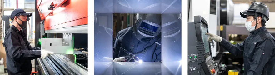 板金・曲げ・切断/溶接/切削・研削・研磨/ねじ加工・穴あけ加工/組立と、ステンレスを中心とした金属製品の製造ラインを構築し、単品製作からワンストップでの最終工程まで短納期で対応しています。